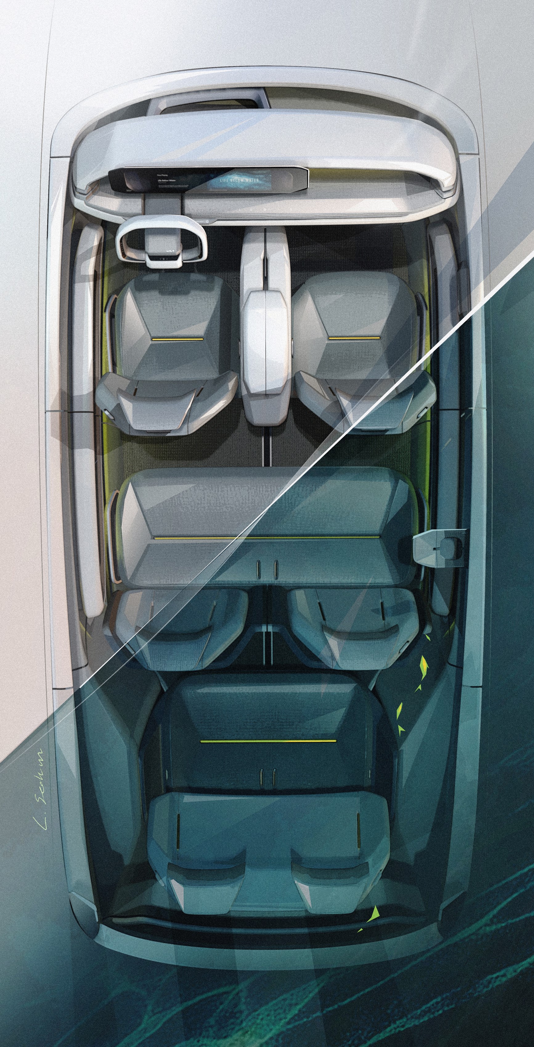 물의 요소에서 출발한 콘셉트 EV9은 ▲바다를 닮은 색상과 ▲물을 보전할 수 있는 지속가능하고 재사용가능한 자원을 실내 소재로 사용, 승객에게 자연과 연결되는 평온한 느낌을 선사한다.