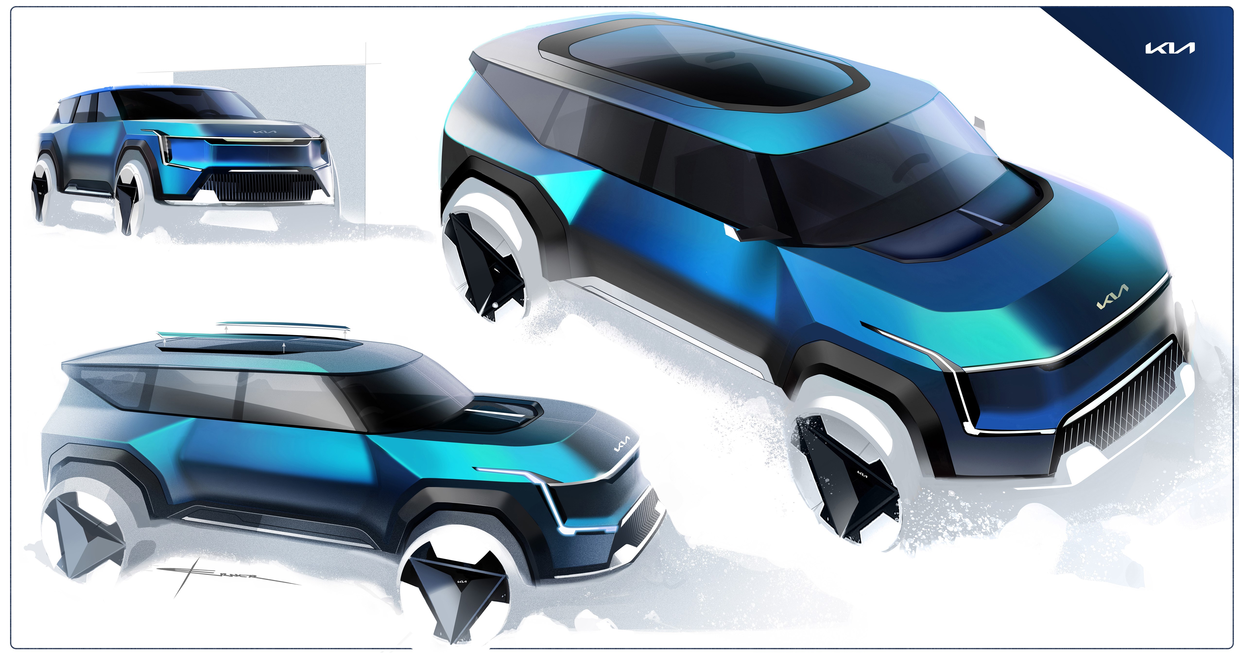기아는 오퍼짓 유나이티드의 다섯 가지 속성 중 ‘자연과 조화되는 대담함(Bold for Nature)’에서 영감을 받아 전용 전동화 SUV의 독창적이고 대담한 형상을 구현했다.