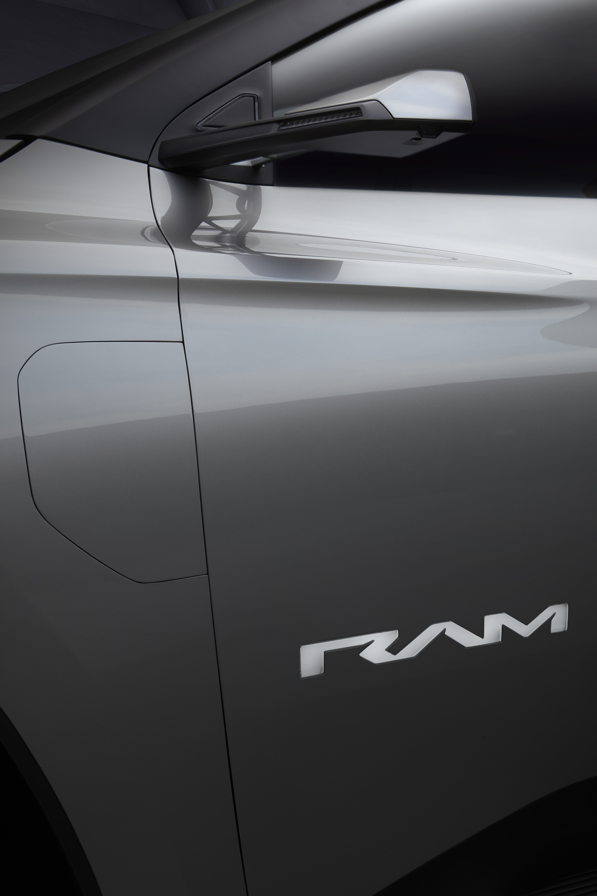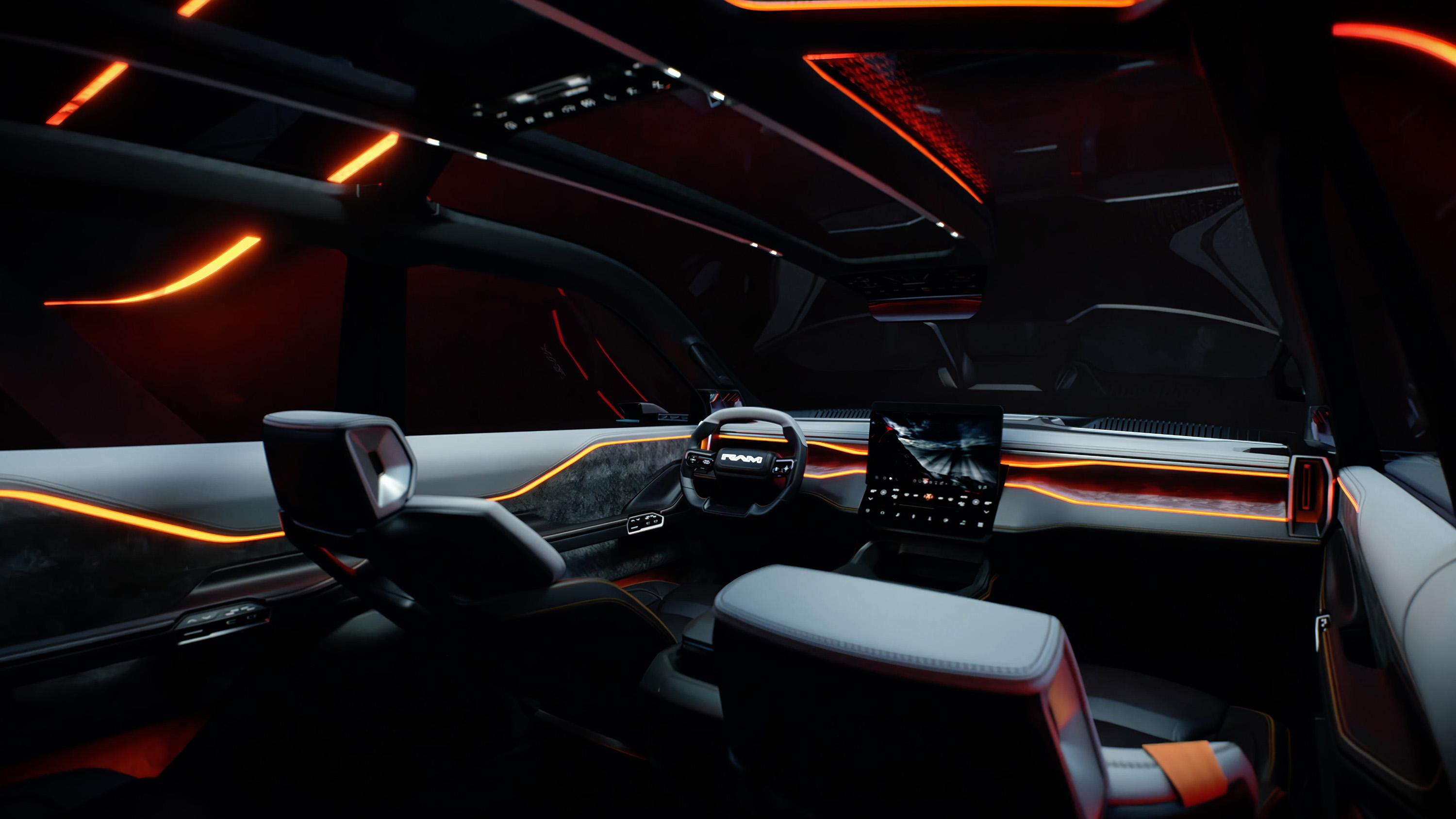 평면 및 하단 접이식 스티어링 휠은 정전식 컨트롤, 디지털 화면 및 조명이 켜진 "RAM" 배지를 통해 향상된 손잡이 기능을 제공합니다.촉각 스위핑 기술을 통해 탑승자는 선바이저 또는 전자 크로마틱 루프 전체를 구성할 수 있으며 불투명도를 조정할 수 있습니다.전자 크로매틱 패널과 통합 루프 레일이 있는 풀 글라스 루프에는 오버헤드 콘솔을 통해 작동하는 주변 번개가 특징입니다.