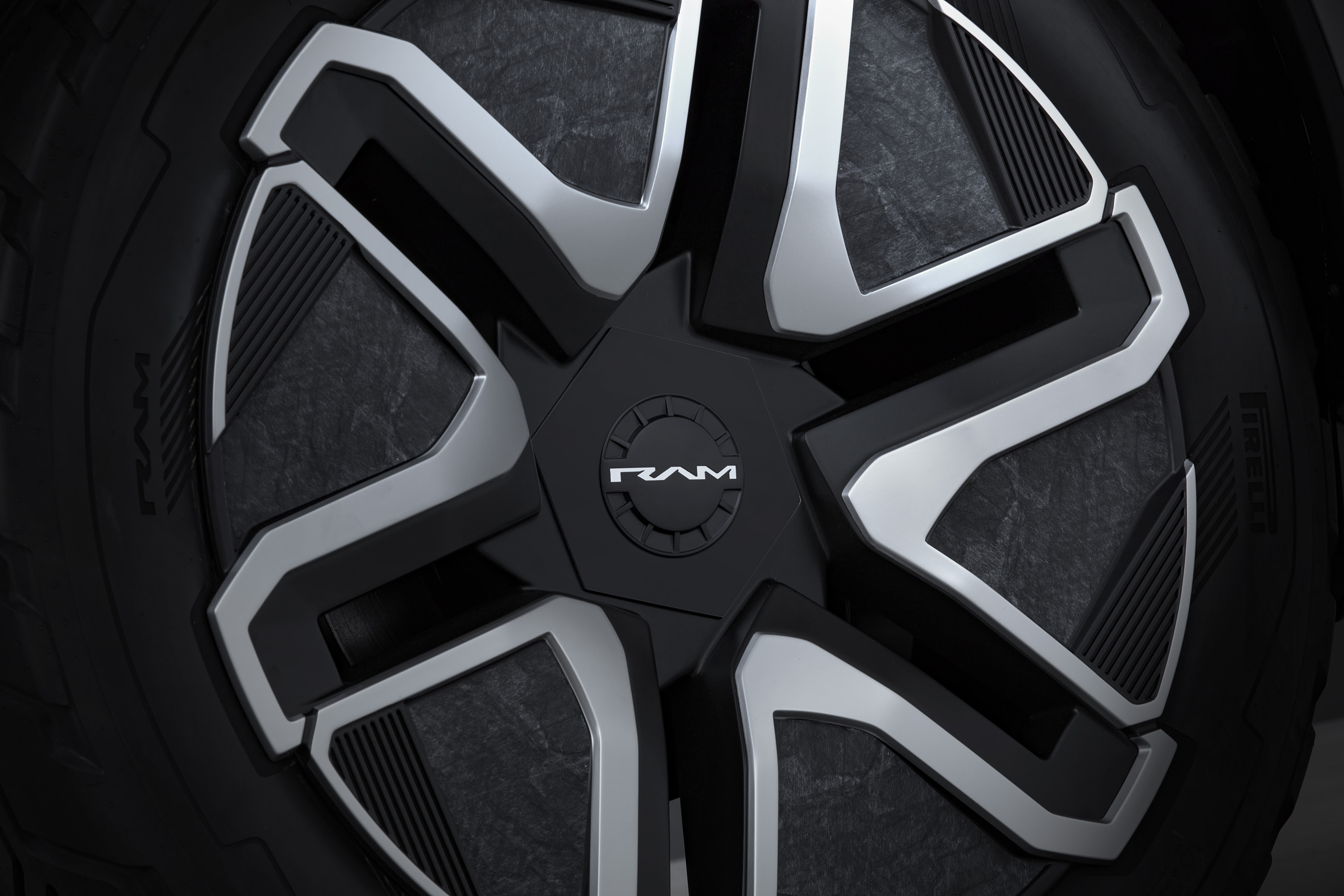 기능이 추가된 눈에 띄는 RAM 디자인에는 파워 다기능 테일게이트와 더 큰 RAMBox가 포함됩니다.날카로운 모래시계 차체 디자인과 펜더 웰은 새로운 독특한 디자인으로 35인치 타이어를 클리어합니다.1500Revolution BEV 컨셉은 셀프 레벨링 기능과 24인치 휠에 장착되며, 중앙 캡을 장착하여 조명을 켜고 제자리에 고정됩니다.