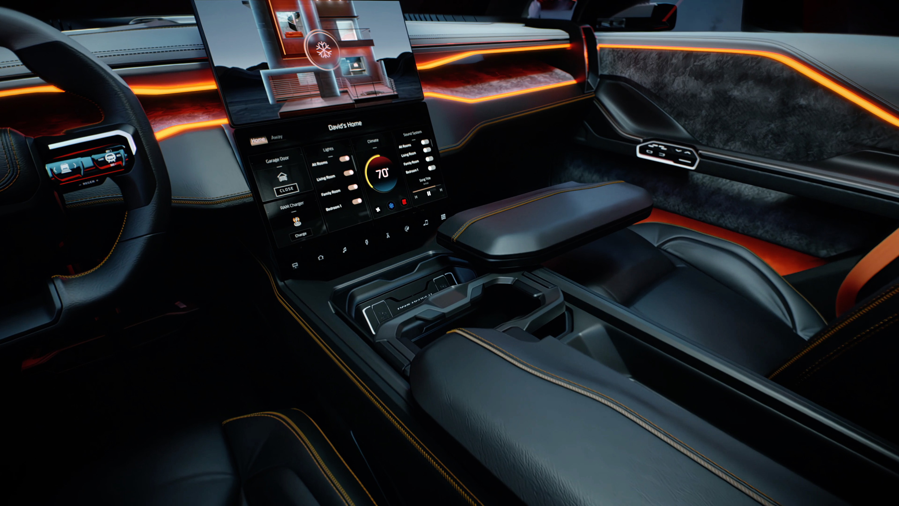 "튜닝 포크" 디자인은 대시보드의 길이를 연장하고 중간 게이트까지 테마 라인을 이어주는 Ram 1500 Revolution BEV 컨셉 안에 있습니다.2개의 스크린으로 구성된 풀터치스크린 디스플레이는 고도의 테크놀로지를 탑재한 인테리어의 중심으로서 최대 28인치 화면 공간을 제공합니다.하부 디스플레이는 작업에 따라 최소 보기, 확장 보기 및 전체 화면 보기 등 세 가지 위치가 있으며, 분리하여 트럭의 다른 영역에서 사용할 수 있습니다.상단 화면은 RAM 레일 부착 시스템에서도 슬라이드할 수 있습니다.