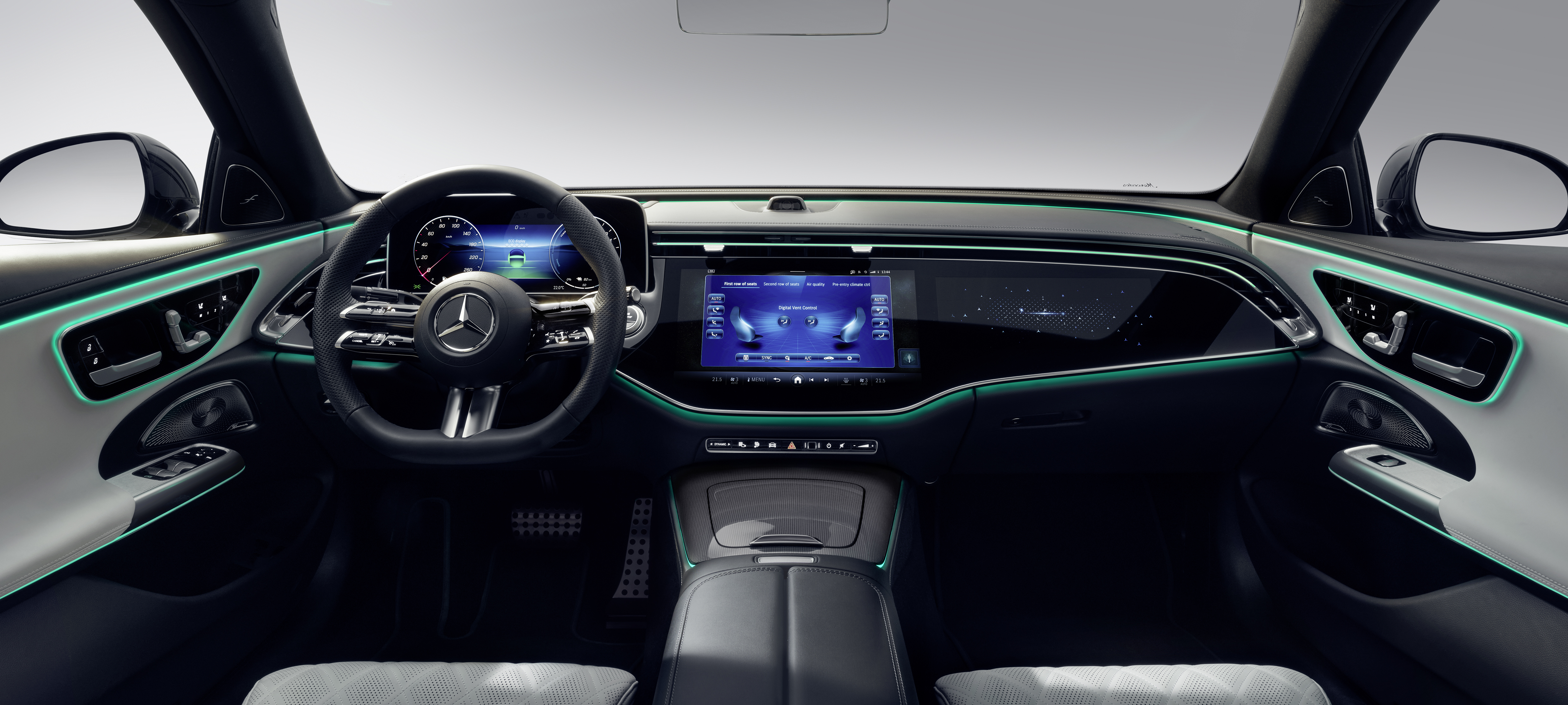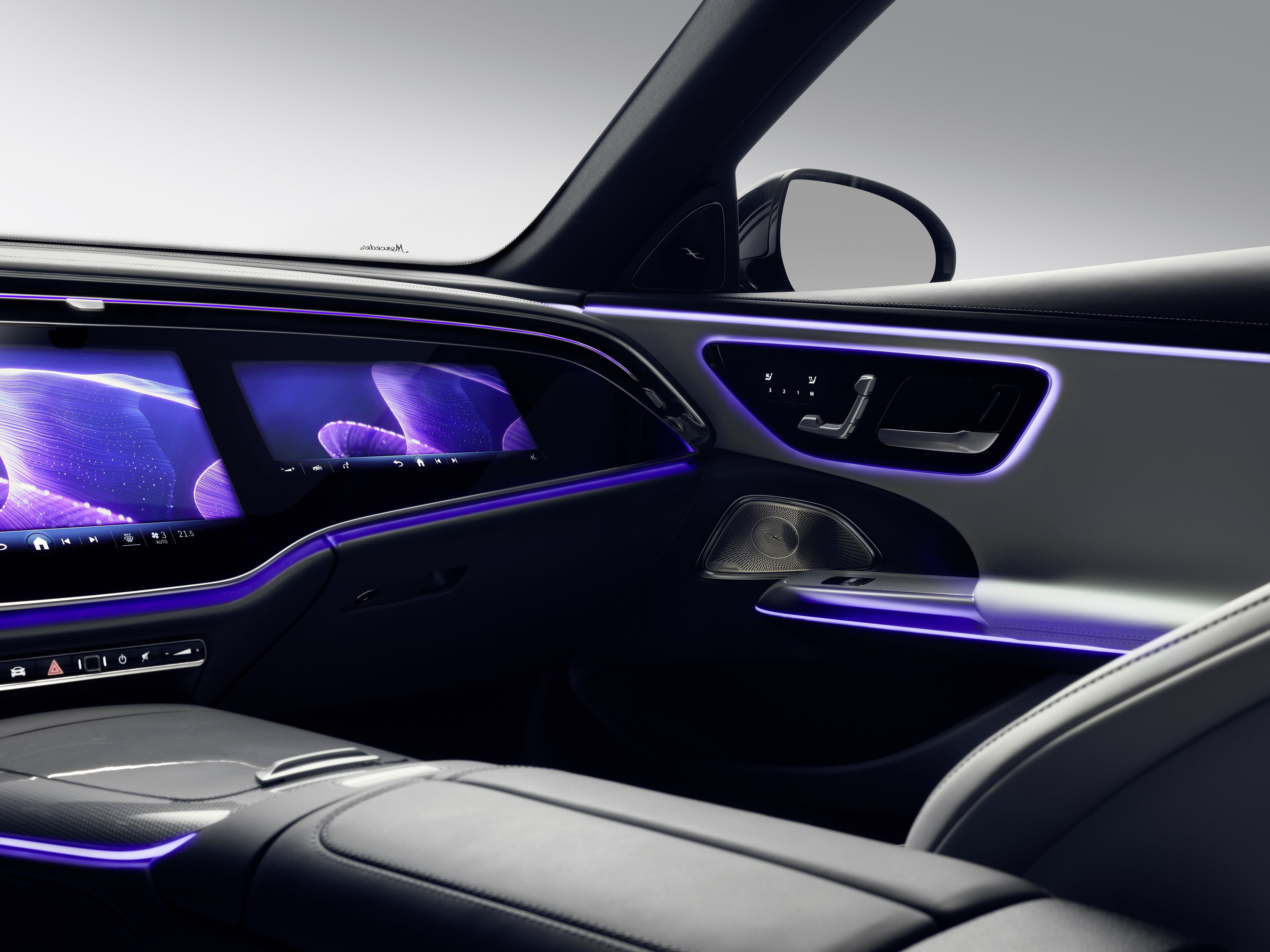 새로운 사운드 시각화 기능이 있는 액티브 앰비언트 라이팅을 통해 더 뉴 E-Class의 탑승자는 음악과 영화 또는 앱의 사운드를 듣고(원하는 경우 Dolby Atmos® 기술 사용), 느끼고(선택 사양인 Burmester® 4D 서라운드 사운드 시스템의 음향 공진 트랜스듀서를 통해), 이제 "볼" 수 있는 등 세 가지 감각으로 음악을 경험할 수 있습니다. 시각화는 액티브 앰비언트 라이팅(추가 옵션)의 라이트 스트립에서 이루어집니다. 이 기능은 E-Class에 처음으로 적용되었습니다. 예를 들어, 빠른 비트의 시퀀스는 빠른 조명 변화를 유발할 수 있으며, 흐르는 리듬은 부드럽게 어우러지는 조명 분위기를 연출할 수 있습니다.