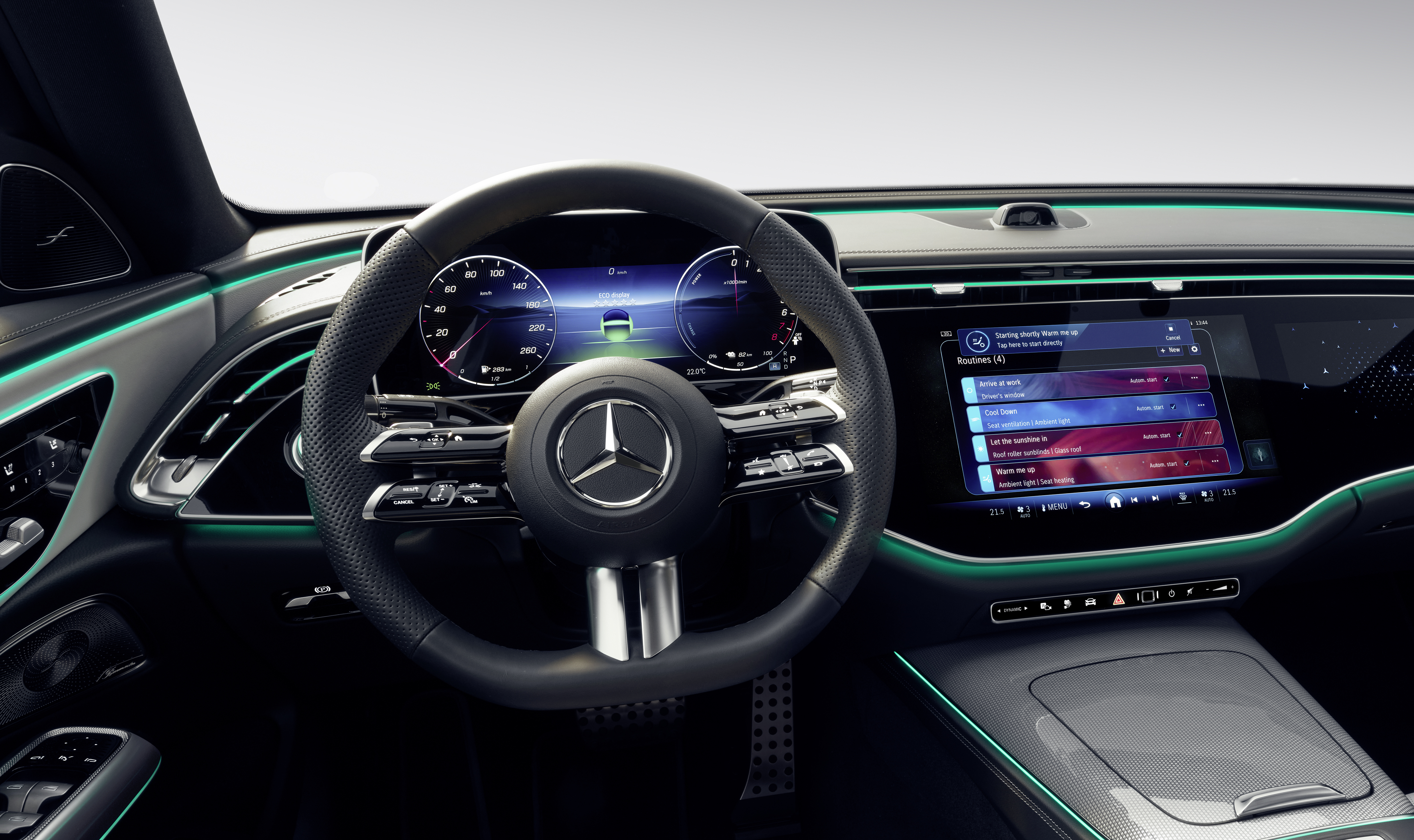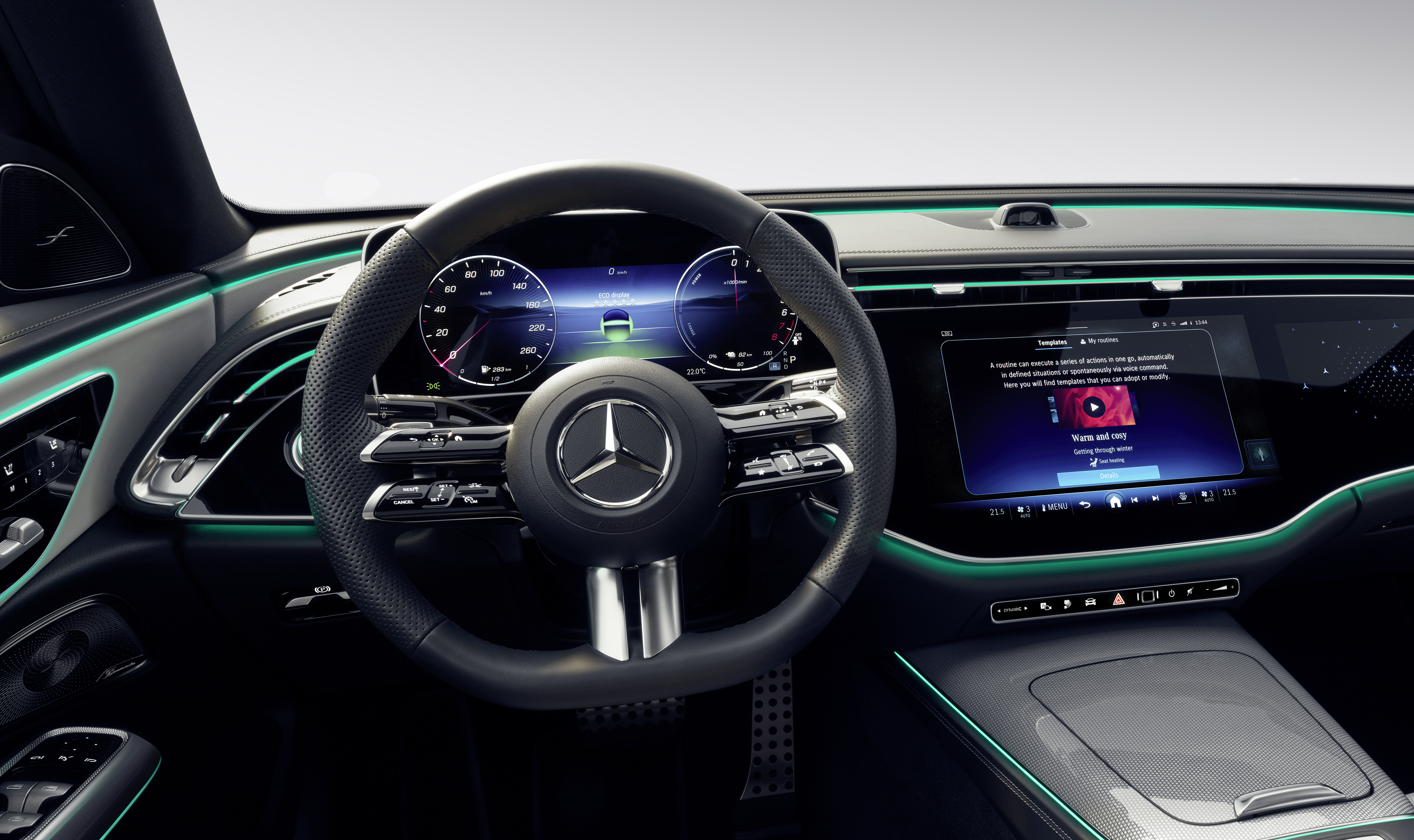 새로운 E-Class가 출시되면 고객은 표준 루틴에 대한 템플릿을 사용할 수 있습니다. 또한 고객이 직접 루틴을 만들 수도 있습니다. 이를 통해 탑승자는 여러 기능과 조건을 연결할 수 있습니다. 예를 들어 "실내 온도가 섭씨 12도 미만이면 시트 열선을 켜고 주변 조명을 따뜻한 주황색으로 설정"하는 식입니다.