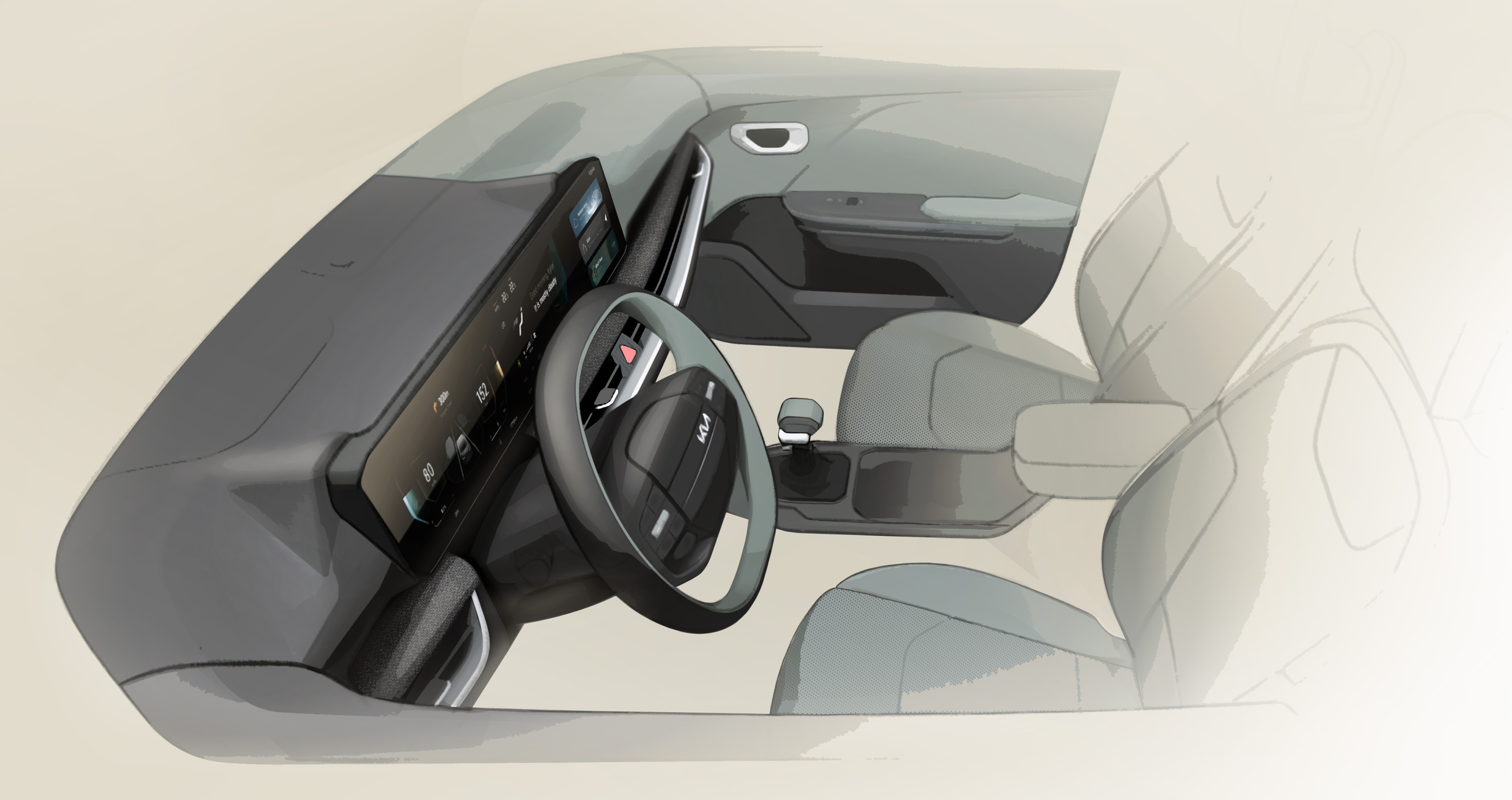 콤팩트 세단 부문에서 '예상되는' 것은 운전자 중심 인테리어인데, K4의 경우 운전자 지향 디자인 개념 자체에 도전하면서 '예상치 못한' 모습이 됩니다. 전통적인 운전자 지향 형태인 운전자를 향해 기울어진 화면과 컨트롤이 아니라, 이 인테리어는 대담한 그래픽 분할로 운전자와 탑승자를 분리합니다. 이 구분으로 두 공간이 명확해지는데, 기술적이고 기계적인 성격의 운전자 cockpit과 편안하고 인간적인 탑승자 캐빈입니다.