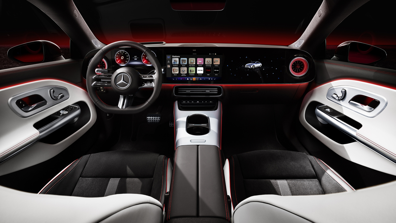 실내는 최소화된 디자인 철학에 따라 핵심 요소만 강조했다. 옵션으로 제공되는 MBUX 슈퍼스크린은 26cm(10.25인치) 운전자 디스플레이와 35.6cm(14인치) 중앙 디스플레이를 하나의 유리면 아래 통합했으며, 출시 후에는 조수석에도 14인치 디스플레이가 추가될 예정이다.